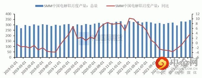 图2:中国电解铝月度产量情况 单位:万吨、%