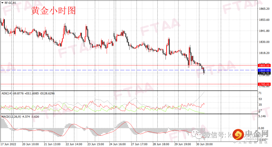 黄金期货周四宽幅震荡下跌,最高1826.60,最低1802.30,日图收出上影中阴,显示短期空头继续主导,日图级别延续偏空。小时图看,金价在昨日亚欧盘持续回落,美盘盘前5月核心PCE物价指数不及预期,叠加初请失业救济人数超预期,数据均利多黄金,金价一度大幅反弹,但美盘时段重新回落。小时图再现A字反转。短线或延续偏空。今早亚盘金价单边下行,操作上可持有空单,或逢高在1800附近轻仓空,止损1805,目标1785。