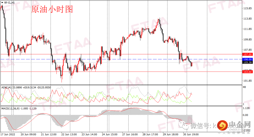 原油周四延续下跌,最高110.43,最低105.08,日图收出长阴线,显示空头继续发力,日图级别或延续偏空。欧佩克8月维持增产64.8万桶/日计划不变,但美国控制通胀决心继续对油价构成压制。油价昨日亚欧盘弱势震荡后,美盘时段重新下落。当前ADX指标高位,MACD指标水下深幅运行,短线或维持偏空。今早亚盘油价小幅冲高,随后持续下行,操作上可持有空单,或逢高在106附近轻仓空,止损107,目标103.60。