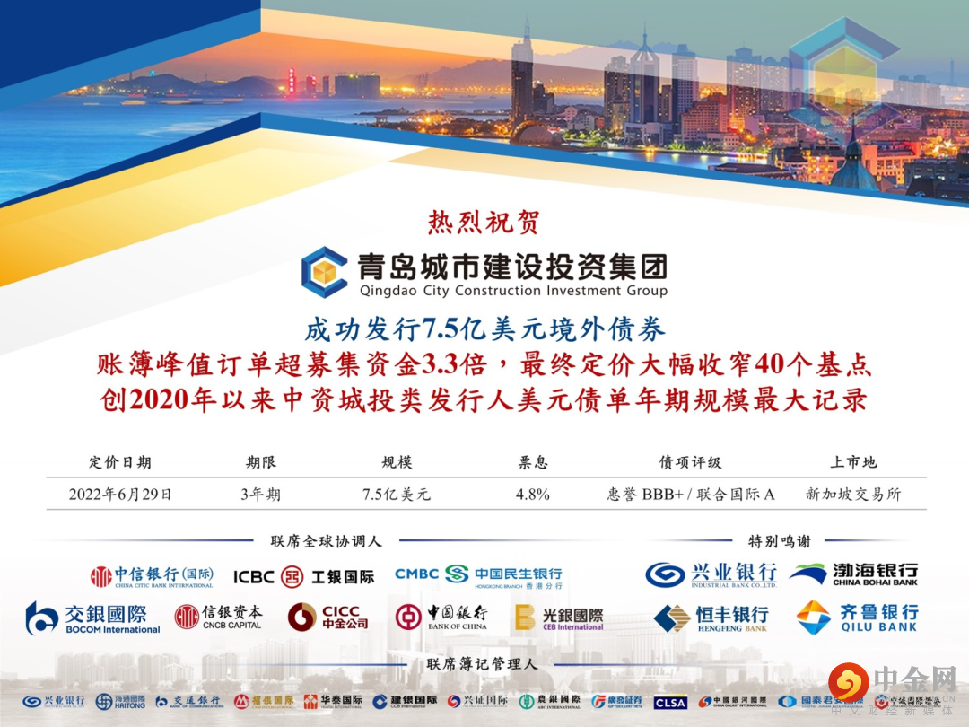 6月29日,交银国际作为联席全球协调人协助青岛城市建设投资(集团)有限责任公司成功发行3年期7.5亿美元高级债券,票面利率4.8%,发行收益率4.8%。创2020年以来中资城投类发行人美元债单年期规模最大纪录。