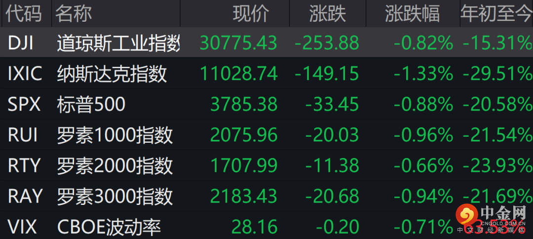 【美股】美股三大指数集体收跌,道指跌0.82%,纳指跌1.33%,标普跌0.88%;上半年,标普500指数累跌20.58%,创下1970年以来最差上半年表现,纳指累跌约30%,道指累跌约15.3%。