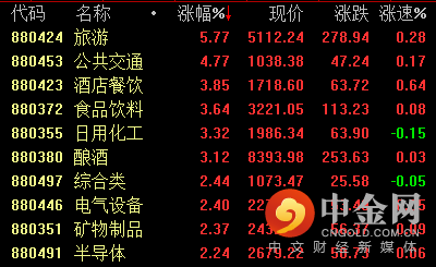 其中,旅游板块大涨5.77%,西域旅游涨12.03%,张家界、大连圣亚、云南旅游、桂林旅游等个股涨停。