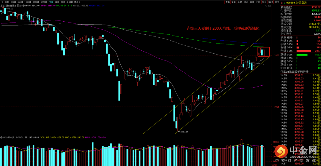 【技术分析】技术面上,A股昨日迎来大跌后的缩量反弹,市场虽然收复了前一根大阴线带来的跌幅,但是成交量的萎缩让市场笼罩着更多疑云。同时,市场已经连续三天受制于200天均线未能有效突破,而上方还有年线的压制,反弹或有钝化迹象,后续需紧密关注年线和趋势线构筑的夹角箱体突破情况。