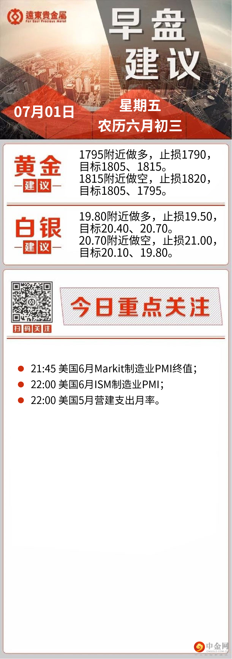展望日内需要关注美国6月ISM制造业PMI和欧元区6月份CPI数据,留意英国、欧元区和美国6月Markit制造业PMI终值的表现,留意美国7月4日独立日长周末前的仓位调整情况。值得一提的是,全球各大央行行长们在葡萄牙举行的欧洲央行年会上表示,降低高通胀将是痛苦的,甚至可能使经济增长崩溃,但必须迅速采取行动,以防止价格快速增长变得根深蒂固。全球多数主要央行正在快速加息,而且未来料将进一步加息,这会增加持有黄金的机会成本,中线会持续对金价形成压制,需要提防金价的破位下跌风险。