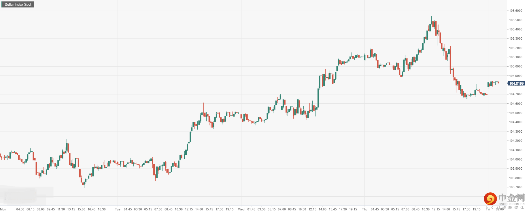 美元指数周四收盘冲高回落后,今日开盘跌0.37%至104.81附近,因美国经济数据好坏参半,略为限制美元上行的空间。