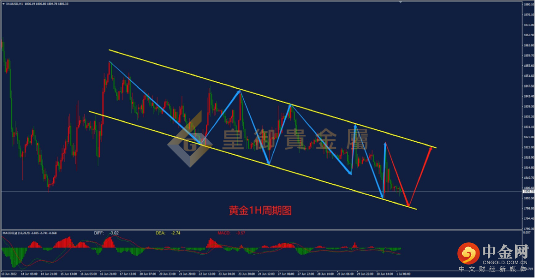 从下图的黄金1H周期图来看,黄金此前自1857一线进行回落后,走出高低点逐渐下移的下跌趋势,并构建下行通道,行情于通道内震荡下行。昨日,行情在触及通到底部支撑后再次强势反弹至通道顶部压力附近,当前黄金再次回调至下方支撑附近。当前从指标上来看,MACD指标的空头动能柱呈现递减形态,且DIFF与DEA双线有即将金叉的迹象,预计行情后市大概率将迎来向上的反弹。当前建议可于下行通道底部支撑1800一线入场多单。