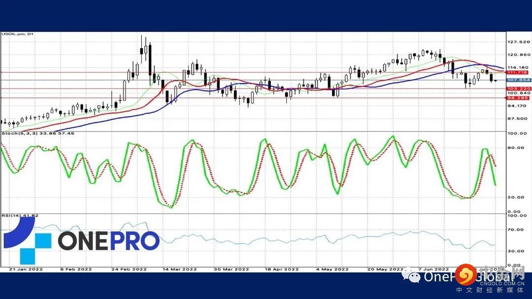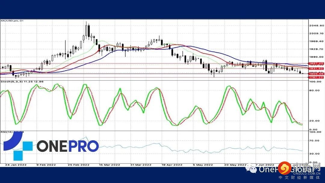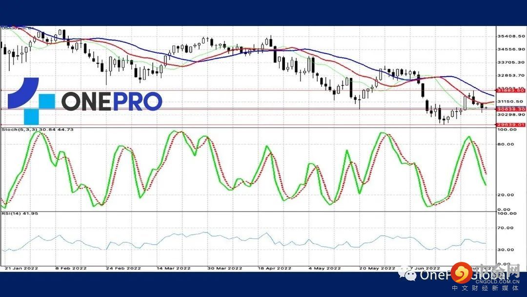 道琼的日线指标中,代表长线的指标Alligator呈现死亡交叉并且开口持续扩大,代表短线的技术指标KD也呈现死亡交叉,长短线都是空方占有优势,投资人适合顺势交易。
