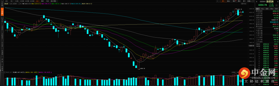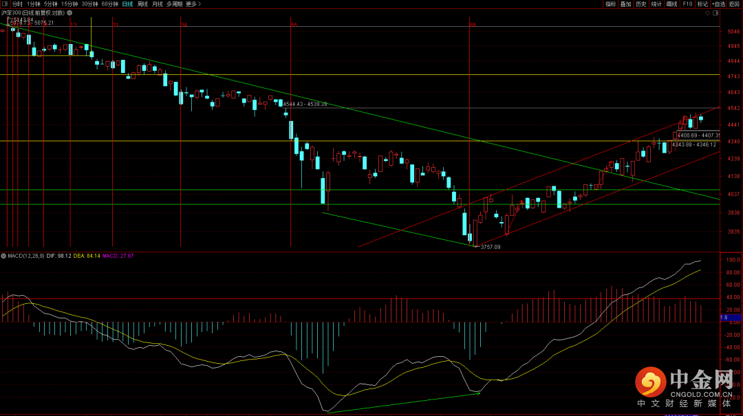 沪深300已经连续四天在上升趋势轨道上轨遇到压制无法突破,短期如果继续维持无法突破的态势,大概率会出现一次修复性调整,下方重点关注4400点附近的支撑,而上方强压依旧会出现在4500点附近。