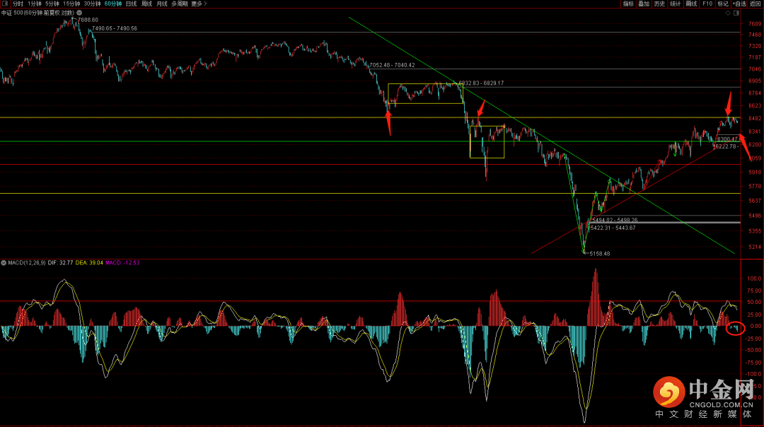 中证500短期已经出现了连续的背驰段,目前可以看出在6500点出现了强压制,后续重点关注6320附近的支撑,如果出现跌破则大概率会回落到中枢平台下沿附近,注意把控好节奏点。