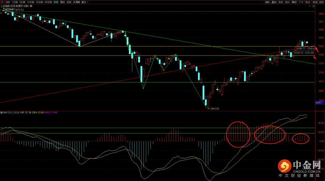 大盘呈现弱势震荡结构,短期重点关注3356点的缺口是否会出现回补,一旦回补才会开启调整走势,短期还需要耐心等待日线顶分结构的形成。关注日线macd量柱的变化在没有出现再次扩张之前大概率还会调整结构。
