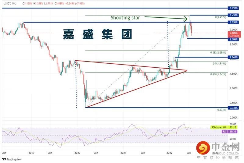 10年期美债收益率上周回落并跌破3%,最低跌至2.791%,当周跌幅超过7%。2018年11月初逼近3.232%,此后不断走低,随着疫情爆发,在2020年3月低至0.333%。收益率随后开始上涨并形成对称三角形,最终在2022年1月第一周逼近尖端并上破三角形。该形态打破后的目标为突破位加上三角形高度,本例中在3.30%附近。2022年上半年,债券价格下跌而收益率不断冲高,半年内就到达前述目标。6月13日当周,收益率攻克2018年11月高点并形成射日之星,伴随着RSI处于超买区域,暗示收益率或回调。这波涨势最高触及3.497%,此后强力下破,目前交投于2.9%附近。下档第一支撑位在5月30日低点2.643%,如果攻克,可能跌至2020年3月低点到6月13日近期高点行情的38.2%回档位,即2.288%附近,接着可能下看水平支撑位2.063%。上档阻力有上周高点3.258%、6月13日当周高点3.497%和2011年高点3.737%。