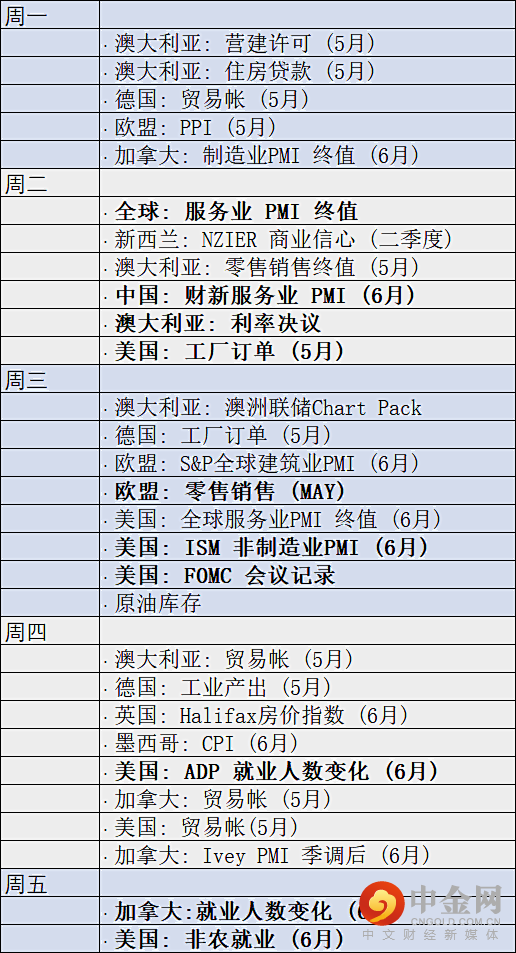 本周经济数据方面的焦点显然是美国非农就业报告,除此以外也有一些数据可能引发震动。比如,周二的中国财新服务业PMI和美国的工厂订单、周三的欧盟零售销售、周四的美国ADP就业人数变化。周五除了美国非农就业报告,还有加拿大就业人数变化报告。本周重要数据详情如下: