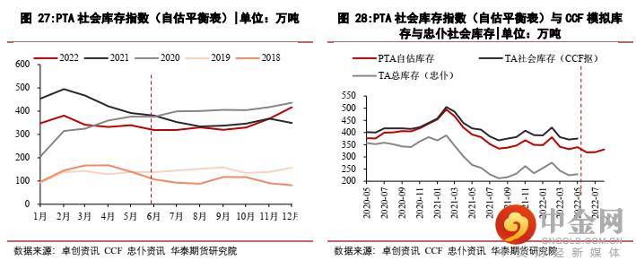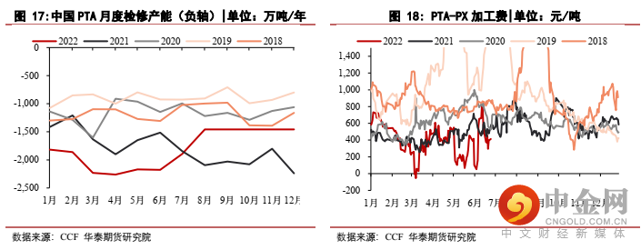 3月中及5月中,一方面是PX的挺价,另一方面是下游聚酯开工的疲软,TA加工费曾一度压制-55及53元/吨的瞬时历史低加工费,从而引发PTA企业亏损性检修加剧,上图明显看到TA检修量级2022年3-6月均维持低位,目前下半年检修计划不多。但关注TA加工费的压制情况,若进一步加工费压缩至300以下,则可能再度出现检修再平衡。