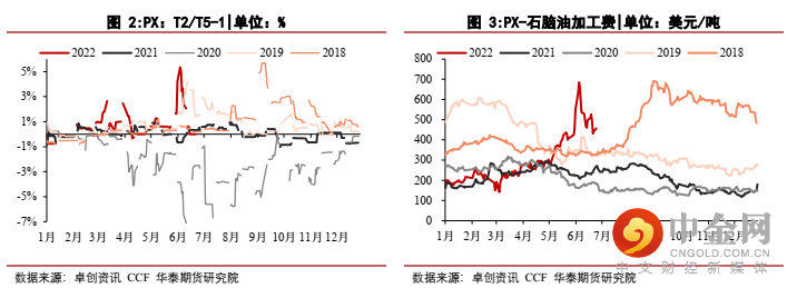 第一方面是在俄罗斯受制裁背景下,成品油出口至欧美的量级出现下滑,而中国成品油由于出口配额的限制,欧美成品油结构性紧缺,首先是柴油然后传导至汽油。第二方面是,二季度美国进入汽油需求增长期,美国夏季汽油对蒸气压要求严格,高蒸气压的廉价组分丁烷等冬季汽油份额被芳烃所替代,因此夏季亦是美国芳烃结构性紧张的时节,带动日韩芳烃套利物流紧张,从而带动日韩PX溢价走高,二季度的PX溢价大幅抬升。第三方面,炼厂重整装置直接出汽油的利润较抽提芳烃的利润,从而更加收紧的外盘芳烃的供应。第四方面,外盘PX紧张的背景下,部分韩国供应商囤货加剧了PX的紧张程度,从而我们看到PX的近远月结构的暴涨与回落。