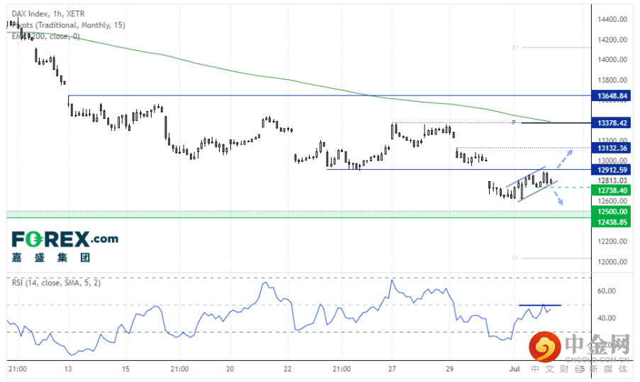 DAX小时图仍处于下跌趋势,但已自上周低点回升。RSI低于50,表明动能依然向下,目前没有任何看涨背离的信号。价格可能形成旗形,下破12,738后或予以证实。受制于12,913我们继续看跌,而站上该位可能意味着逆势反弹行情扩大,但第一步就可能面临13,000的狙击。