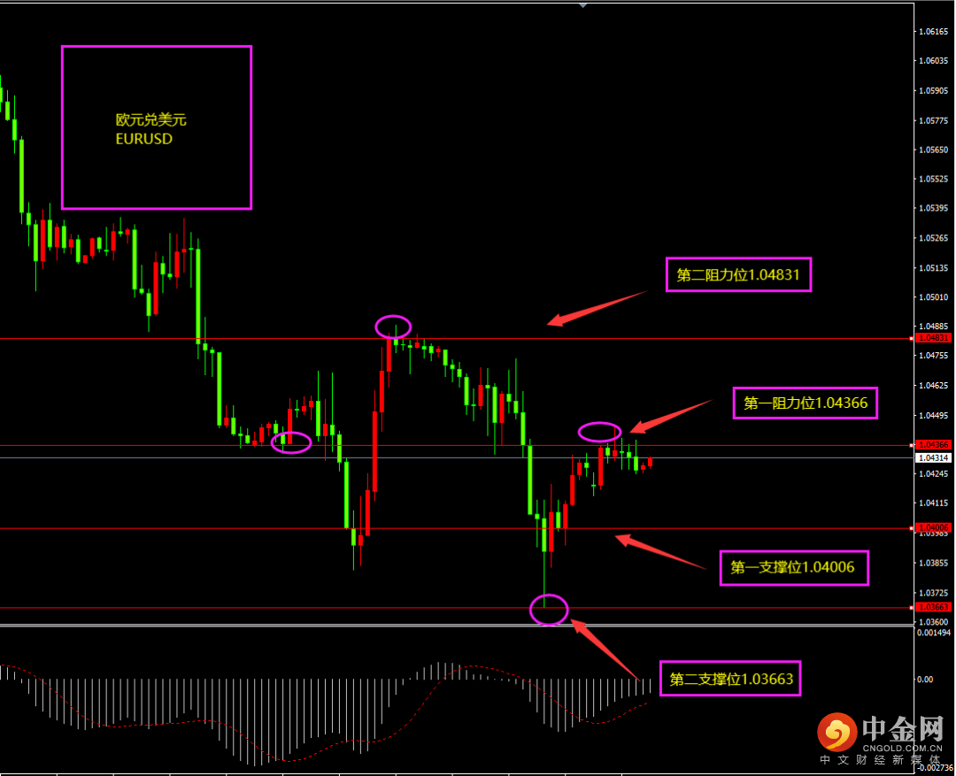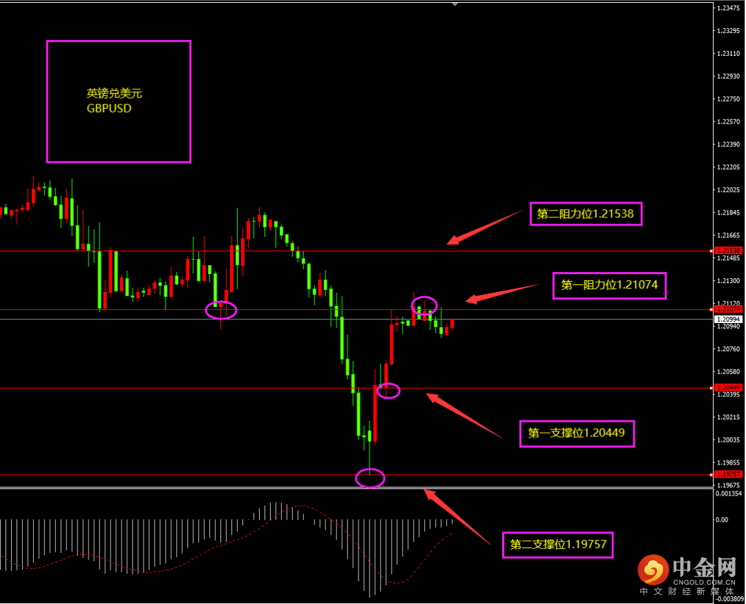 天图英镑收阴线,价格虽有回落,但实体部分较小,空头不强,短期下影线较长,多头仍在,目前底部刺而不破,“底背离”仍然有效,日内更多以震荡以及震荡上行为主。小时图英镑期间下行幅度放缓,MACD逐渐上移,空头减弱,短期底部有连续阳线拉升,多头增强,日内更多以逢低看多为主。