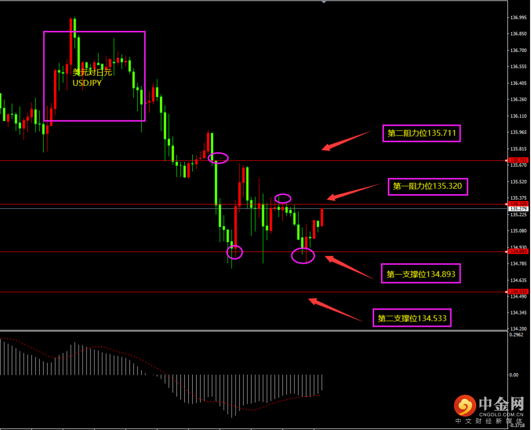 天图美日收阴线,价格有所回落,但实体部分较小,空头力度不强,短期上方进入高位震荡,随着空头的释放,日内更多以偏震荡为主。小时图美日期间下行幅度放缓,MACD逐渐上移,空头减弱,短期底部有连续阳线维稳,多头增强,日内更多以震荡带有一丝上行为主。