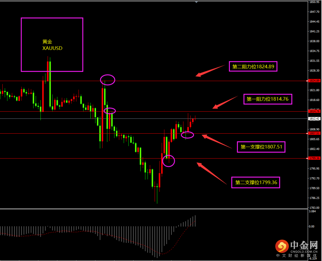 天图黄金收阳线,下影线较长,价格一度回落之后反弹,底部空头遭受多头反扑,目前大方向看涨,随着底部多头的增强,日内更多以逢低看多为主。小时图黄金期间暴跌暴涨,MACD转移至0轴之上,多头占优,短期上方无大阴线回落,空头不强,日内更多以震荡以及震荡上行为主。