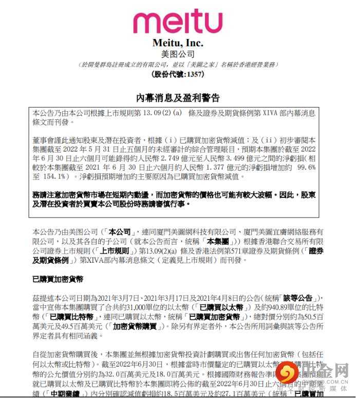 7月3日晚,港股上市公司美图发布公告称,今年上半年,公司净亏损可能达2.749亿元至3.499亿元人民币,较上年同期约1.377亿元的净亏损增加约99.6%至154.1%。净亏损预期增加的主要原因为已购买加密货币减值。