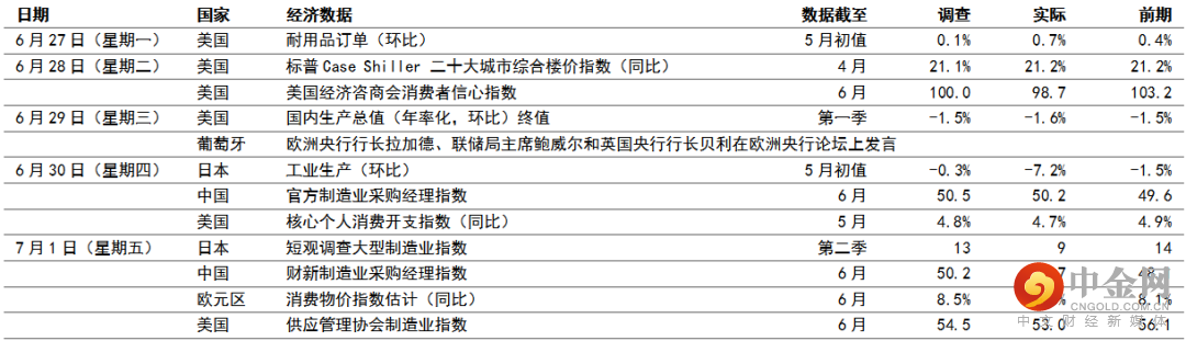 预期德国5月份工业生产增长0.3%(环比),低于4月份的0.7%(环比)。工业生产继3月份大跌后,于4月份的反弹幅度有限。欧元区综合采购经理指数终值预期将确认6月份的初步估计51.9。初步数据显示疫情后重新开放的动力减弱,加上物价上涨挤压实际收入,令扩张步伐减慢。