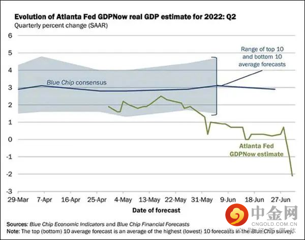 亚特兰大联储GDPNow预测模型最新公布的数据显示,预计美国二季度GDP将萎缩2.1%,较前一日的预测值-1%大幅下修。此前,美国一季度GDP增速为-1.6%,从传统的衰退定义来讲,若连续两个季度萎缩则将意味着美国经济陷入技术性衰退。