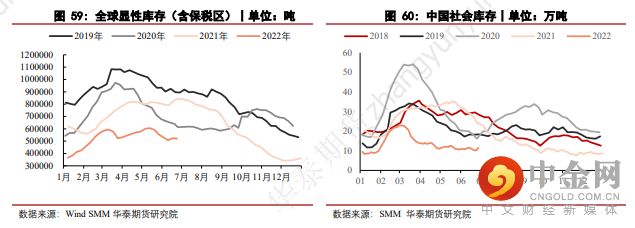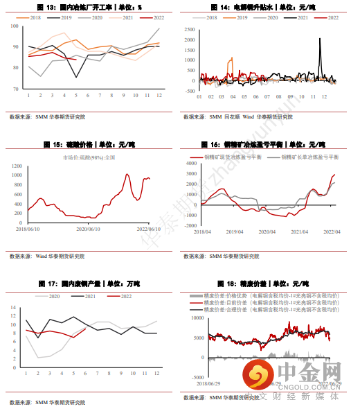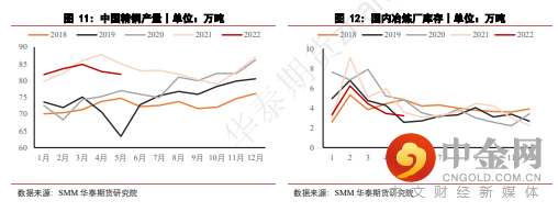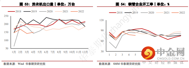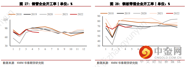 4. 初级加工方面,进入6月,上海地区逐步解封,消费需求向好,但美联储在6月议息会议上完成75bps地加息,不断向市场表达其坚定的鹰派态度,大宗商品市场情绪悲观,铜品种也未能幸免,铜价大幅走弱。在此过程中,国内市场下游企业畏跌拒采情况严重,多以按需采购为主,鲜见主动补库的情况。预计三季度中后期,市场情绪趋于稳定后,初级加工端的采购行为才有望再度活跃。