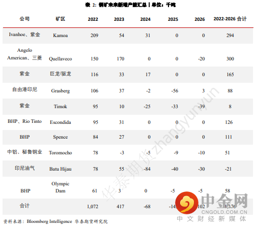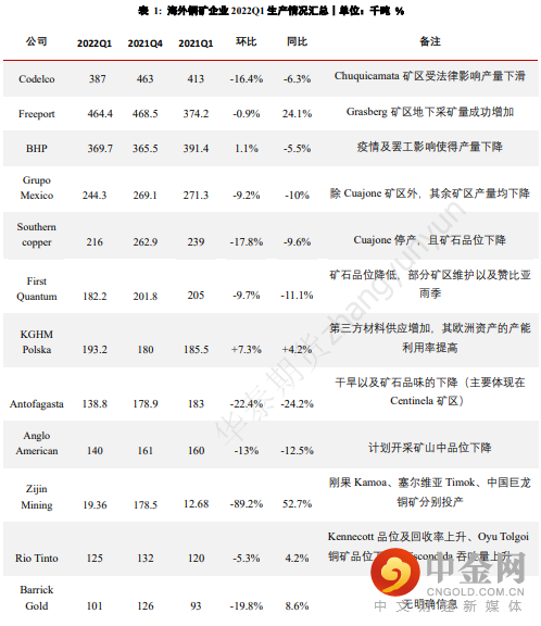 此外,据全球主要矿企2022Q1财报汇总得出,多数矿区Q1产量有所下降。除去上文所提及的罢工等因素外,疫情影响及矿石品位下降,都是导致Q1产量下滑的重要缘故。尤其是矿石品位的下降,在一定程度上打击了矿企对于后续资本支出的积极性,如Teck计划在2023年削减其QB2项目的资本支出。因此,对于更远期的展望而言,铜矿供应或将渐趋紧张。