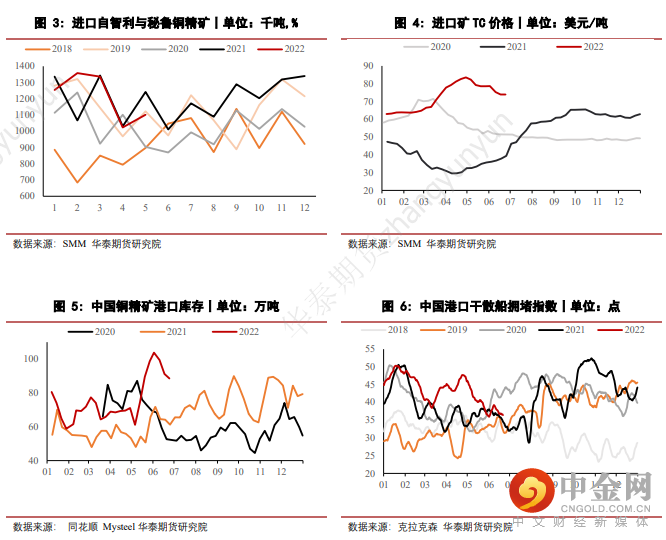 从2022年1-5月整体情况看,国内进口铜精矿累计达607.36万吨,主要来源为秘鲁与智利,较去年同期仍呈现0.91%的小幅上涨。