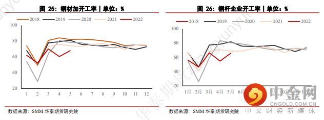 初级加工端方面,受疫情影响,多数加工企业4月的开工率明显下降。5月铜材开工率较4月虽然出现环比回升,上涨7.46个百分点至67.85%,但仍显著低于往年同期水平。需求端复苏不及供应端明显。其中,处于电线电缆上游,占初级加工端45%左右的铜杆企业,5月开工率环比回升11.18个百分点至65.86%,但同样低于往年同期。进入6月,上海地区逐步解封,消费需求向好,但美联储在6月议息会议上完成75bps地加息,不断向市场表达其坚定的鹰派态度,大宗商品市场情绪悲观,铜品种也未能幸免,铜价大幅走弱。在此过程中,国内市场下游企业畏跌拒采情况严重,多以按需采购为主,鲜见主动补库的情况。因此诸如与终端基建密切相关的铜杆企业,也并未能立刻出现需求迅速恢复的迹象。