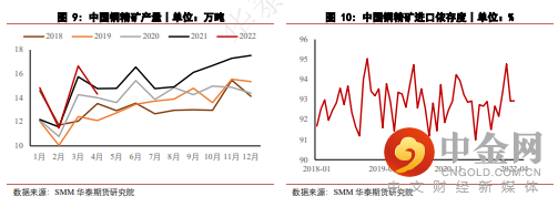 2022年1-5月,国内铜精矿产量为55.41万吨,累计同比上涨7.39%。4月较3月产量环比下降2.34万吨(14.03%)至14.42万吨。4月至5月间,受疫情影响产量下降明显。随时疫情褪去,产量下降趋势将得到改善。但是国内对铜精矿进口依存度超过90%,国内矿企生产状况对实际矿端供应影响有限。