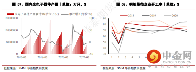 总体而言,国内电子板块在一定程度上受到了疫情的影响,但与其他板块相比,影响并不显著,5月产量回升也相对迅速。与电子相关的铜板带箔企业开工率在5月间环比回升1.15个百分点至69.11%。由于电子3C类消费品价格不如商品房以及汽车高昂,叠加目前各类直播平台对于电子产品的代购也相对火爆等因素。预计电子板块在后市表现偏乐观,但此类产品在铜需求中整体占比不算太高,因此对于整体需求的提振或许较为有限。