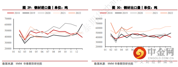 2022年1-4月,国内铜材累计净出口达9.56万吨,较去年同期相比上涨5.03倍。主要原因是由于2022年对于部分铜材而言,取消了此前1.5%至4%不等的关税,使得铜材出口激增。