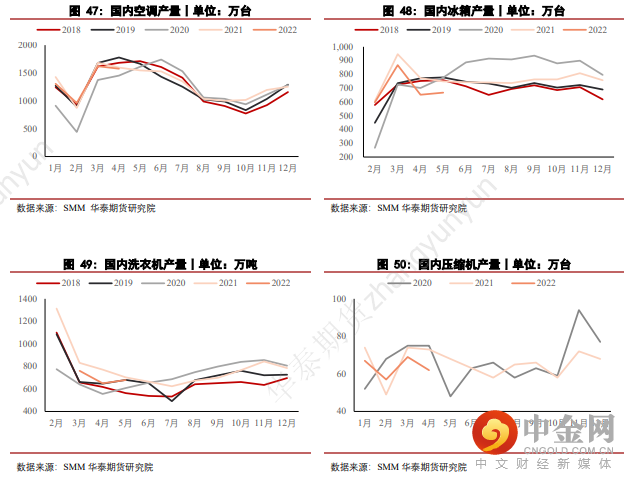 在新能源汽车方面,5月间环比增长同样靓丽,产量录得49.5%的增长至46.60万辆,销量则是录得49.6%的增长至44.70万辆。此前,国内三大主要汽车生产基地吉林、上海、广州先后遭受到了新冠疫情的袭扰,使得4月汽车产量出现了较为明显的下滑,如上文所言,5月汽车产销量便录得明显回升,在铜品种的需求上,波动并不显著。