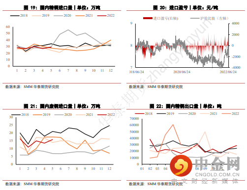 3. 进出口方面,国内疫情好转,上海地区解封。此前受疫情影响而无法进入国内市场的进口铜逐步流入。海外方面,欧美主要经济体为抑制通货膨胀压力,实施央行货币收紧政策,抑制市场需求,外盘价格或将持续偏弱。进口铜盈利窗口期增多,下半年进口量也将会维持相对较高位置。