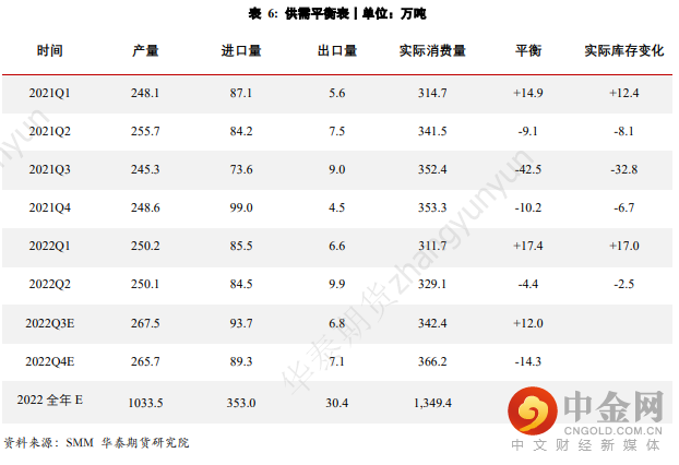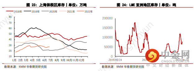 从目前情况来看,6月间库存水平略有回升,但整体依旧处于偏低位置。预计此后在高利润的驱使下,3季度供应回升仍将快于需求,故3季度内出现累库的概率较大;4季度中,由于炼厂检修以及需求逐渐恢复等因素的影响,库存料将再度呈现去库,但由于宏观因素的干扰(如海外通胀水平的回落),预计铜价因去库而出现大幅走高的概率并不大,下半年整体以震荡格局为主。