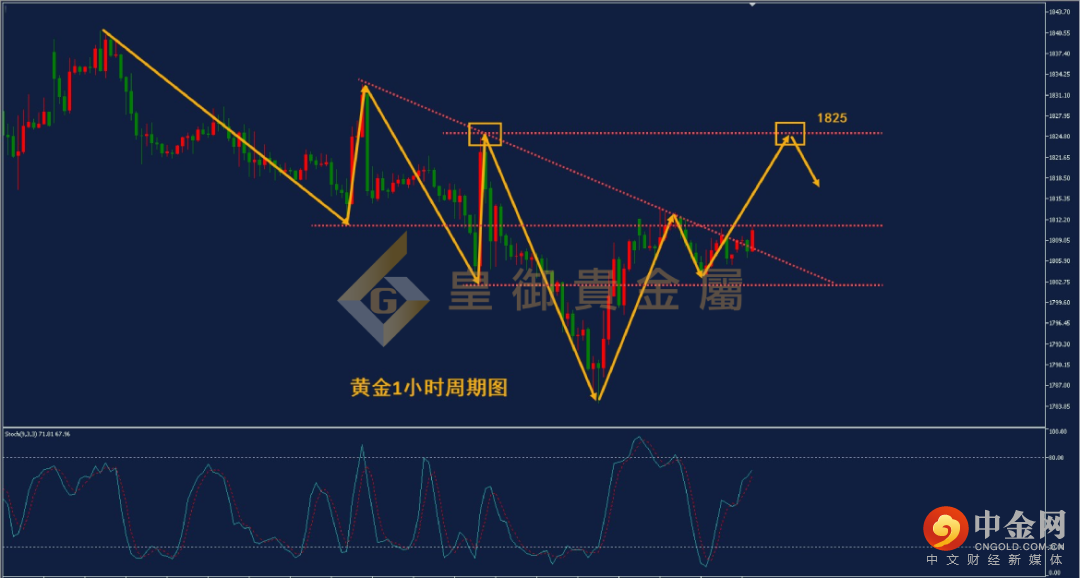 从黄金1小时周期来看,黄金在低位走出头肩底的技术形态,并且已经突破颈线位压力。当前黄金多空强弱关系已经发生转化,多头逐渐占据上风。目前黄金Stoch指标依旧向上发散,意味着黄金向上的动能依旧保持良好。投资者依旧可以寻找低点位置布局多单,也可以关注上方压力位布局空单。目前黄金上方1825附近为前期高点水平压力,预计本轮上攻至此后回落概率较大,投资者可以尝试在此位置布局空单。