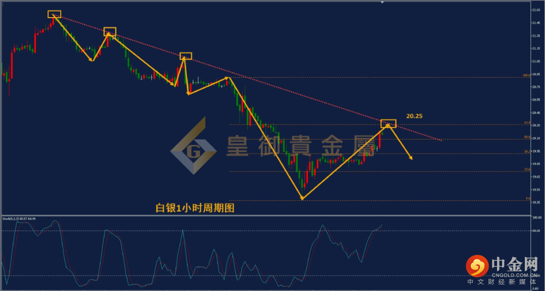 从下方白银1小时周期图看,白银沿着下跌线震荡下行。昨日白银突破短期震荡整理区间后向上发起进攻,当前价格已经逼近下跌趋势线压力位附近。从整体结构看,白银的下跌趋势并未改变,逢高做空依旧符合当前的趋势结构。而本轮反弹目标位20.25附近,既是下跌趋势线压力位,同时也是前期下跌段斐波那契61.8%的压力位。建议投资者尝试在此位置布局空单。