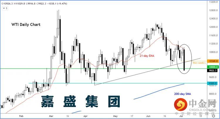 上述种种担忧占据了投资者的脑海,油价跌势因此可能持续一段时间。投资者现在更可能逢高沽出而不是逢低买入,在一根趋势线告破的情况下尤其如此。请看下图: