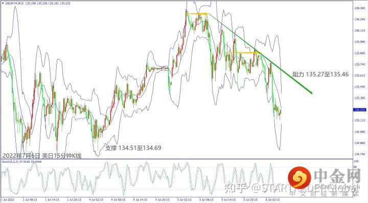 日级别线图,出现避雷针反转,一旦跌破135.00关口,可能转跌;15分钟K线,短线形成盘跌,下降趋势线反压,大有可能回测前低支撑。