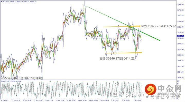 昨天(5日)两国加入北约造成欧美股指下跌逾2%。晚间美国公布经济数据利好,带动道琼斯和纳指逆势上涨超450点。预期今天(6日)欧元区公布零售销售数据不佳,德指一旦跌破小时布林带中轨12,511,建议可偏空操作。预期今天美国公布经济数据不佳,道琼斯若跌破5日均线30,949,建议可偏空操作。