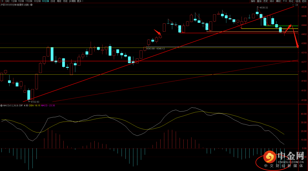 沪深300直接一笔修正了六十分钟的背驰段结构,短期险守4407后续重点关注这个位置是否会出现收盘跌破的走势,如果出现则还会继续向下去试探4300到4350点的平台支撑。
