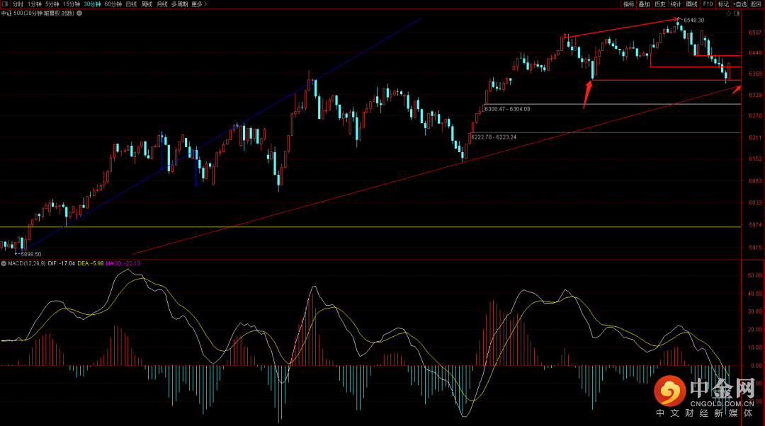 中证500在三十分钟的上升趋势线附近遇到支撑,短期需要注意支撑的有效性,如果能够不跌破6340则大概率会有一笔三十分钟的反抽笔出现,注意观察6479点附近的压制。而从日线结构看这边已经有开始走终结段的走势,依旧需要保持逢高出局的机会,耐心等待日线底分型的再次出现。