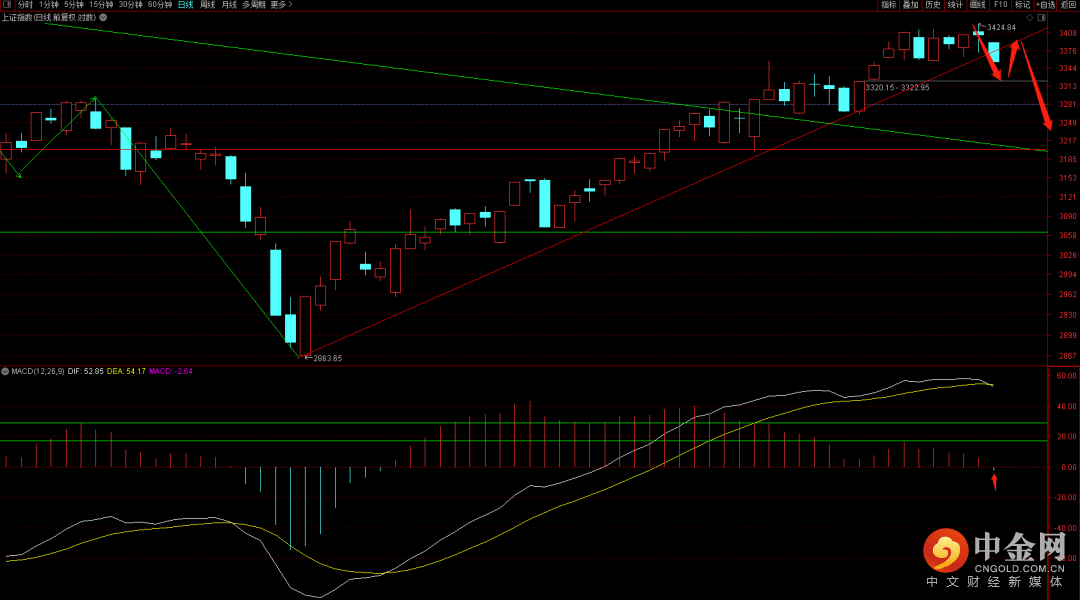 大盘早盘出现跳空低开,之后出现弱势下跌,短期重点关注3331点支撑,如果跌破了则大概率会继续向下回补3320点支撑,在没有跌破3262之前大概率还会有一笔反抽3359点到3392点中枢的机会。注意短期六十分钟的结构是否形成。而日线已经呈现调整态势注意后续逢高出局的机会,即使再次的向上回补缺口新高也很难持续太久。