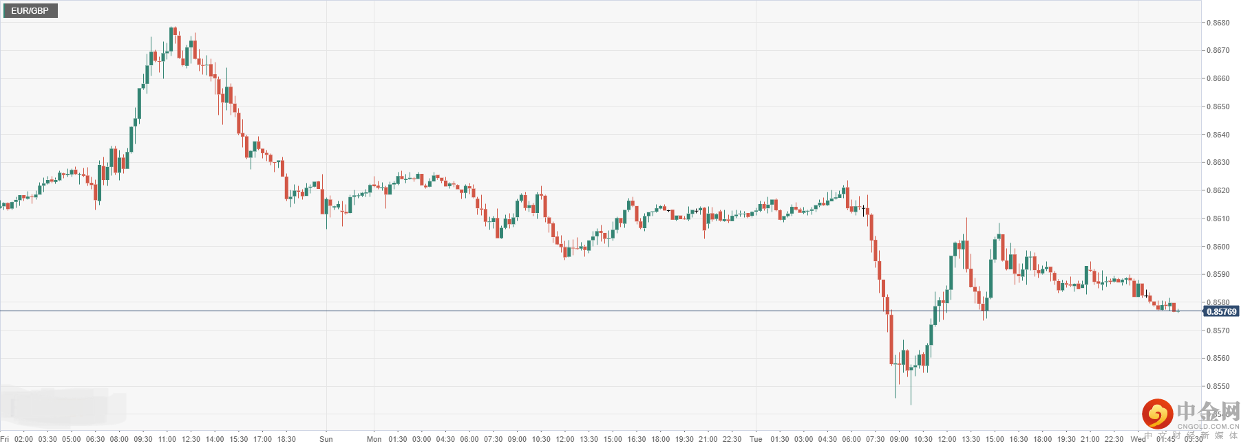 欧元兑英镑周二盘中一度震荡下滑后,今日开盘跌至0.8576,因市场押注欧央加息步伐放缓和英国经济及政治局面不稳定,使得欧元下行承压且英镑上行支撑有限。