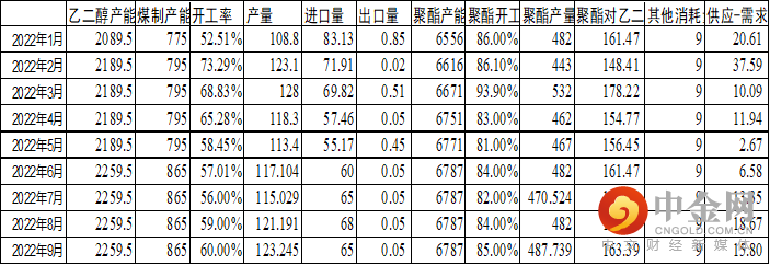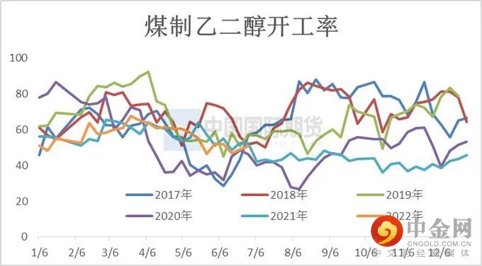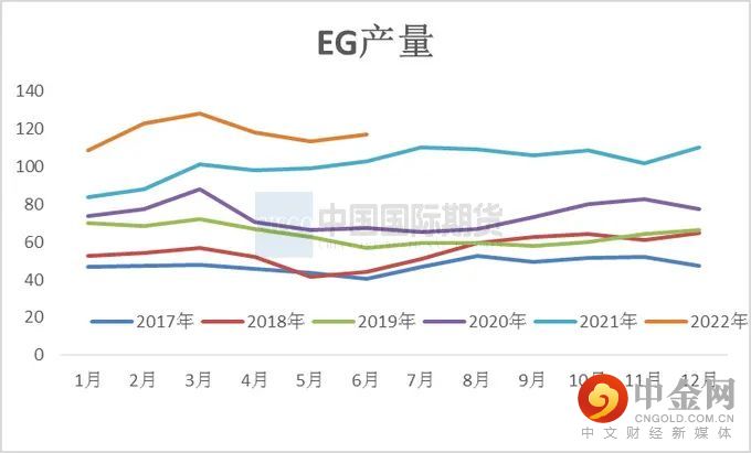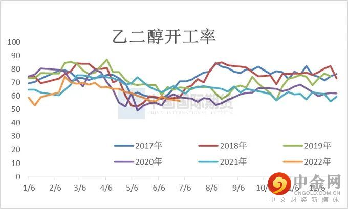 近五年来国内乙二醇产能保持较高增长速度,特别在2021年国内乙二醇产能增速为29.43%,截止6月份乙二醇总产能为2259.5万吨,煤制乙二醇总产能为865万吨。随着检修季到来以及煤制效益压缩,煤制乙二醇装置检修逐步落实,5月起煤制负荷回落明显,6月煤制乙二醇开工率为49.47%,较上月下降2.91%。今年集中检修较往年略晚,主要由于今年上半年受原油上涨支撑,整体煤制效益有所修复,部分检修略有延后;其二是去年下半年煤价无序上涨,且煤市紧张,成本压制下出现部分煤制装置长期停车及重启延后的情况,今年检修时间点也有所后移。6-7月有110万吨装置计划检修,还有235万吨装置年度检修计划未定,140万吨装置暂无检修安排,6月煤制装置检修较集中,下半年尚未检修装置的检修计划或许较为分散,关注后期检修计划落实情况。