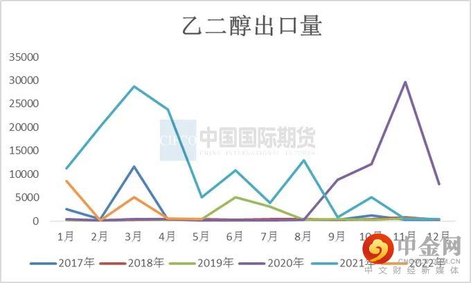 2022年5月份乙二醇出口量为0.45万吨,环比增加733.26%,同比减少11.79%,出口总额约为351.79万美元,出口单价为777.44美元/吨。