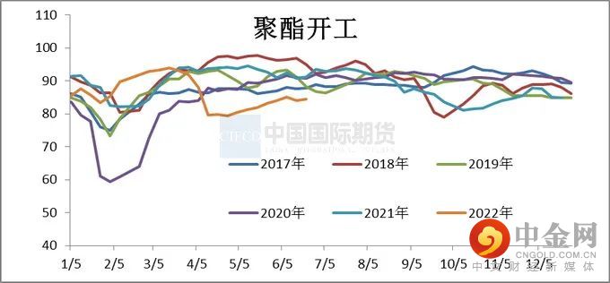 6月聚酯开工负荷略有提升,聚酯开工从5月底的83.1%上升至6月底84.4%。6月平均聚酯开工率为84.3%。由于聚酯工厂成本压力偏大、库存偏高,导致聚酯工厂维持偏低开工负荷,对EG消费量回升非常有限。6月下半月聚酯面临困境,价格快速下跌带来的负反馈导致聚酯现金流亏损加剧,同时聚酯企业5月份以来库存升值的红利消失,且面临快速贬值的压力,高库存的聚酯企业尤其是龙头企业减产压力再次加大。月底几家龙头聚酯企业计划再次宣布自律减产30%。