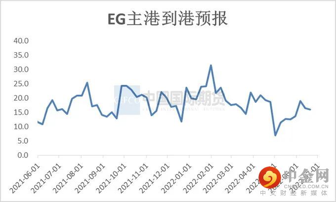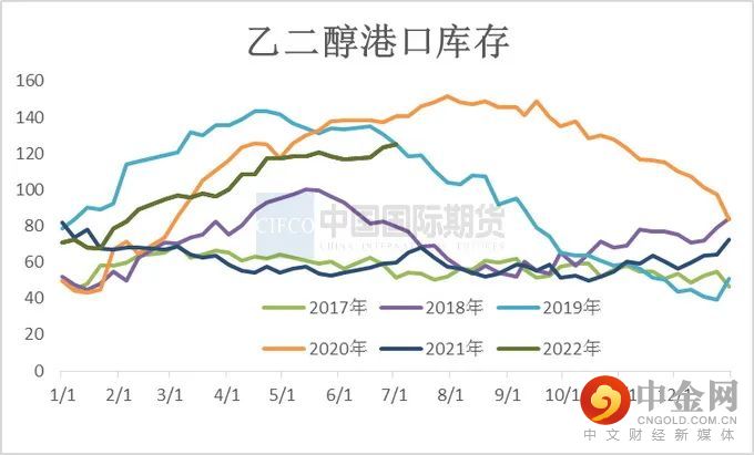 6月底华东主港地区MEG港口库存约125.1万吨附近万吨,5月底港口库存118.7万吨,6月较上月增长6.4万吨。6月乙二醇主港出货持续表现偏弱,聚酯开工负荷仅在83%-84%水平,且整体回升力度缓慢,聚酯工厂多执行合约为主,现货端口补货意向不高。船期来看,7月底美国货将会集中到港,预计港口库存仍高位运行。