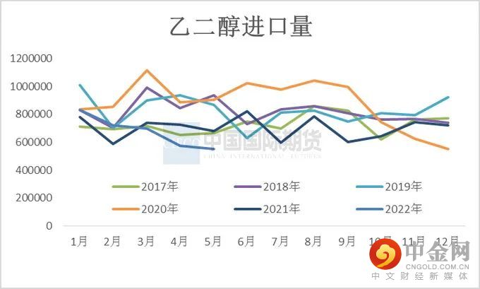 2022年5月我国进口乙二醇55.17万吨,环比减少3.99%,同比减少19.05%,本年内累积进口量337.49万吨,比去年同期减少4.05%。当月进口金额37558.210万美元,均价680.8美元/吨,较4月均价减少10美元/吨。乙二醇大扩产周期下整体进口量维持收缩为主,近洋装置中部分产能被优先清退。但是远洋货源具有一定成本优势,且受其他板块需求变化影响增加,挤出过程仍存一定变数。7-8月来看,随着印、欧两地的需求转弱,全球市场货源将重新调配,进口量可能略有增加。