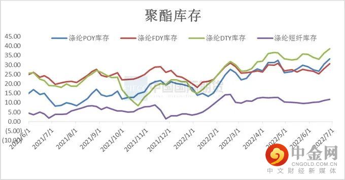 6月底POY库存天数33.1天、FDY库存天数30.6天、DTY库存天数38.6天、涤短库存天数11.7天;瓶片工厂库存仍在8天附近。产品库存逼近年内高位,并且下游在经过5月底采购后,6月没有追加补货的想法。